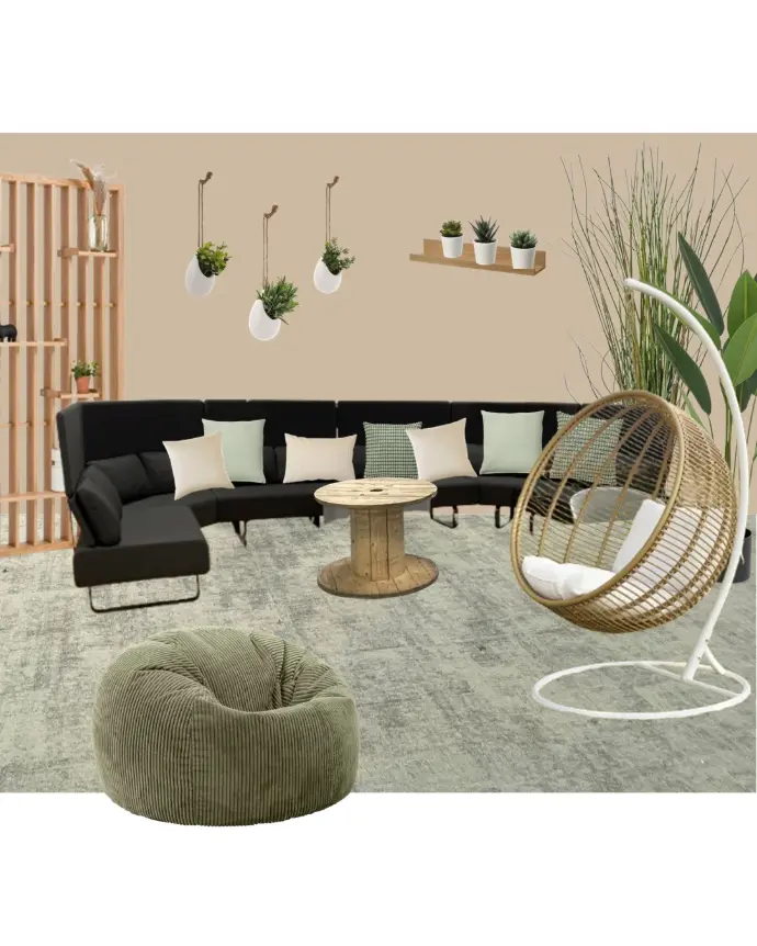 Le fauteuil suspendu apporte une touche ludique à l'espace. Les plantes vertes trouvent place au sol mais aussi dans des décorations suspendues au mur. Enfin les tapis permettent de délimiter davantage cet espace pouvant également servir à accueillir des visiteurs de façon moins formelle.
